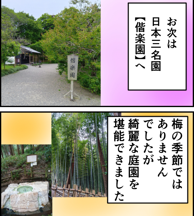 憧れの日本三名園の、石川県の兼六園・岡山県の後楽園・茨城県の偕楽園!梅の季節ではありませんでしたが、偕楽園に行きました!!実は、私はずっと東京の後楽園遊園地が三名園の一つだと思っていました・・・「後楽園遊園地はすごいなぁ」と思っていました(笑)