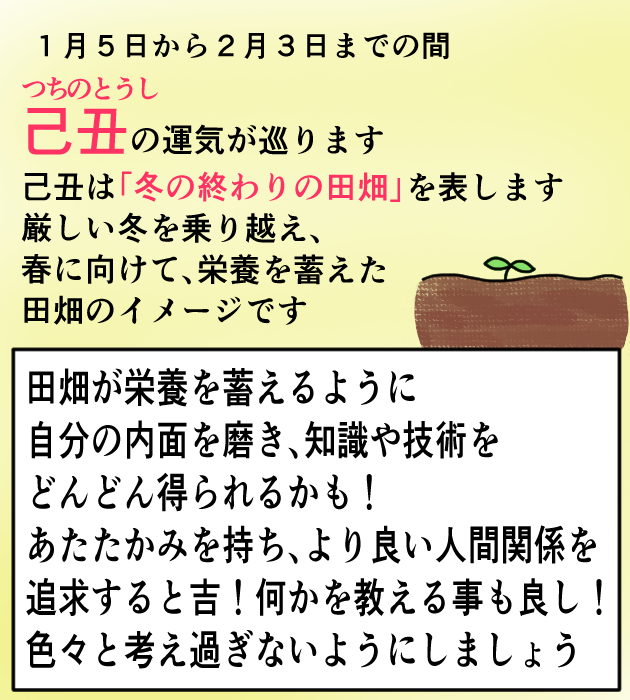 四柱推命では2月の節入り日「立春」から1年が始まるという考え方です。各月の始まりも節入り日となります。1月は5日の「小寒(しょうかん)」が節入り日です。「小寒」は、寒さが厳しくなり始める頃という意味です。本格的に寒くなってくる時期ですね。