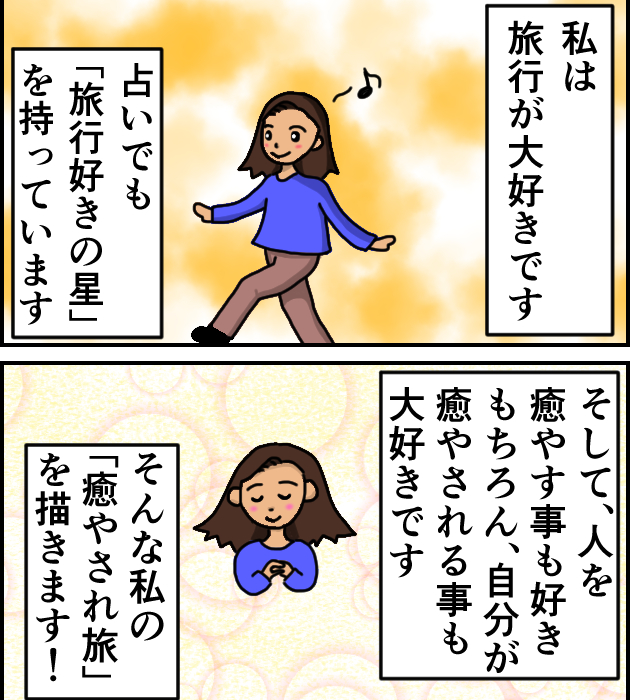 私は、四柱推命で「偏印」という星を持っています。「旅行好きの星」とも言われています。そして「癸」の星も持っています。癸は「癒やしの星」です。人を癒やす事も好きですが、もちろん自分が癒やされる事も大好きです!そんな私の「癒やされ旅」を【癒やされ旅ブロガー】としてご紹介します!