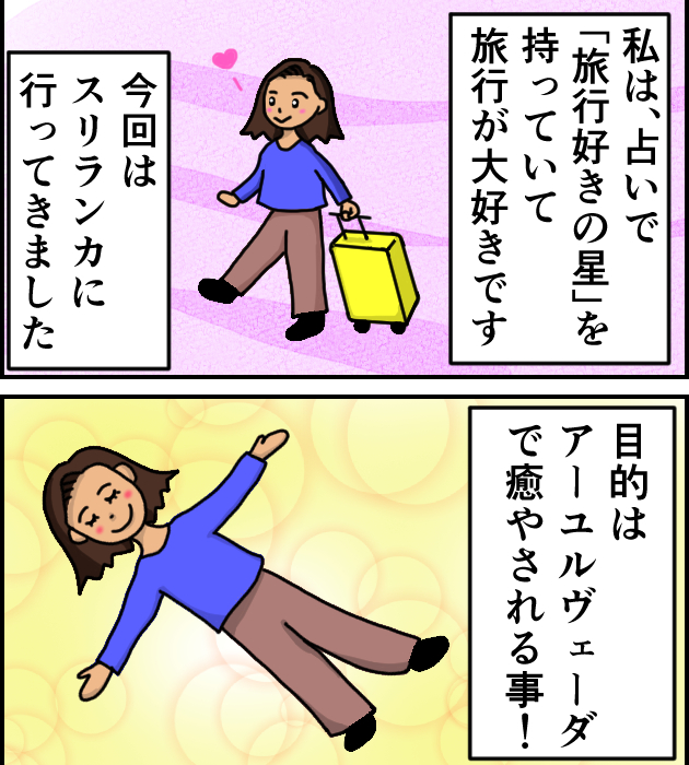 今回の癒やされ旅は、4泊6日でスリランカに行ってきました。スリランカはインド洋に浮かぶ島国です。日本との時差は3時間30分です。日本が正午の時、スリランカは午前8時30分です。そしてアーユルヴェーダとは、5,000年の歴史を持つインド・スリランカ発祥の伝統医療です。「ヴァータ」「ピッタ」「カパ」の3つのドーシャ(=体質)があり、自分のドーシャバランスを知り、整えていきます。