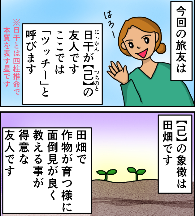 ツッチーは、一緒に国内・海外色々な所に旅行しています。会うと、パワーをもらえる大好きな友人です!日干(=四柱推命で本質を表す星)が癸(=雨・小川)の私にとって、日干の象徴が田畑のツッチーは道しるべを示してくれる大切な友人です。