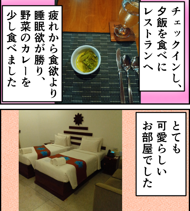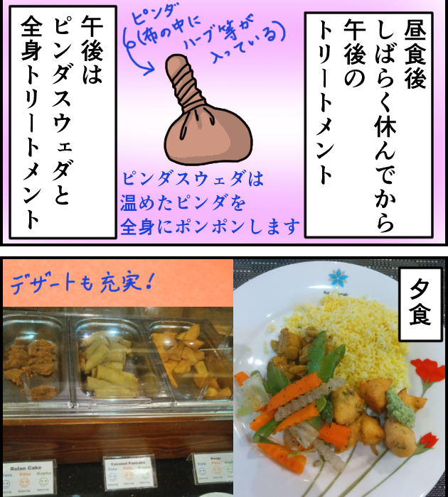 午後のトリートメントはピンダスウェダ。これも体がポカポカしてとても気持ち良いです!夕飯はケーキやココナッツパンケーキ等デザートが充実していました。どれも美味しかったです。