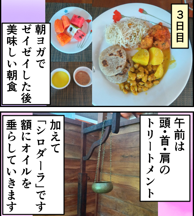 3日目も朝6時からヨガ!健康的ですが、私は相変わらずゼイゼイしながらヨガしました。朝食も美味!!フルーツも充実していて美味しいです。そして午前のトリートメントは額にオイルを垂らす「シロダーラ」。アーユルヴェーダというとシロダーラを思い浮かべる方も多いのではないでしょうか。