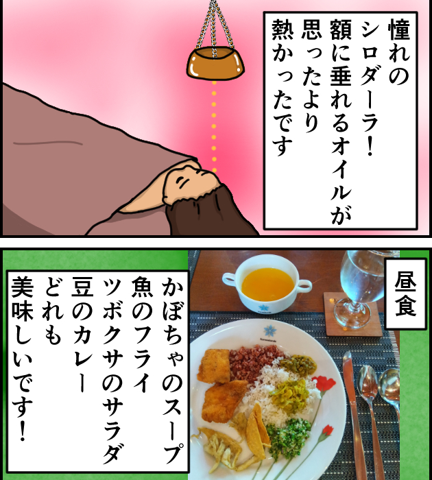 憧れていたシロダーラ!とても気持ち良かったですが、オイルが思ったより熱かったです。昼食も美味しくいただきました。野菜多めのお料理ですが、お肉やお魚もあります!