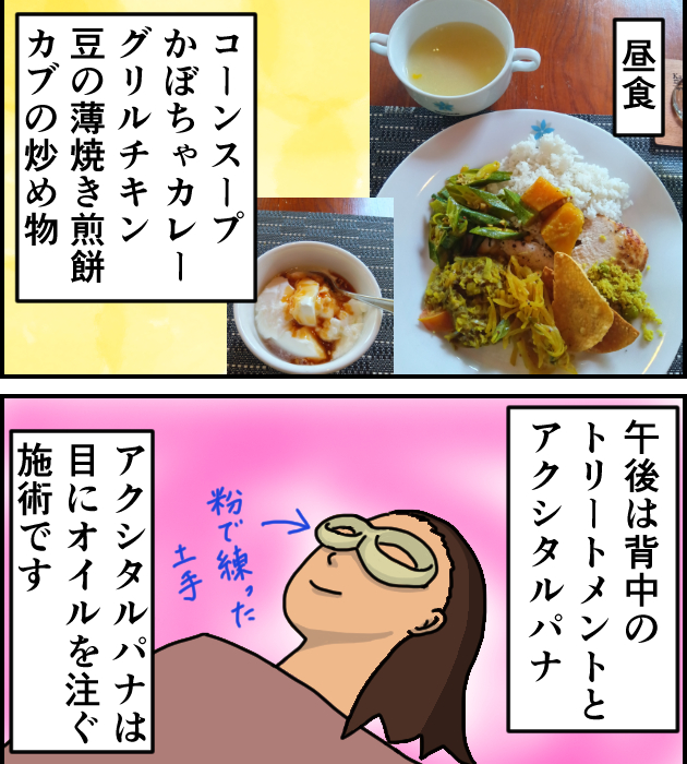 午後の施術は、アクシタルパナ。粉で練った土手を目の周りに置いて、その中に温かいオイルを注ぎます。そして「右向いて、左向いて、ぐるっと回して」と眼球を動かす指示が出ます。施術後はぼや~っとしていますが、だんだんクリアになります。施術後はスマホやパソコンを見ないように、と言われます。貴重な体験でした。