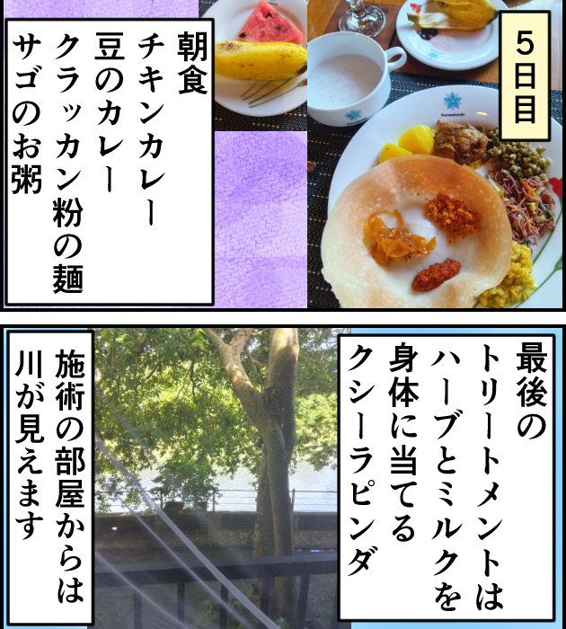 「クラッカン粉」とは、スリランカで多く栽培されている雑穀クラッカンを粉末にしたものです。「サゴ」とは、サゴヤシから抽出される澱粉です。最終日なので、トリートメントは午前中のみでした。ハーブとミルクを布で包んだハーブボール(ピンダ)を身体にポンポンと当てるクシーラピンダもとても気持ちが良かったです。施術のお部屋からは川が見えて、ゆったりした景色にも癒やされます。