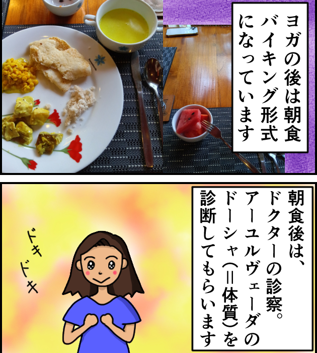 朝からヨガをして、気持ちよく朝食をいただきました。食事の時は、お水ではなく「白湯」が必ず出されます。そして、温かいハーブティも飲み放題です。身体を冷やさない事は大切ですね!そしていよいよドーシャ(=体質)診断です。