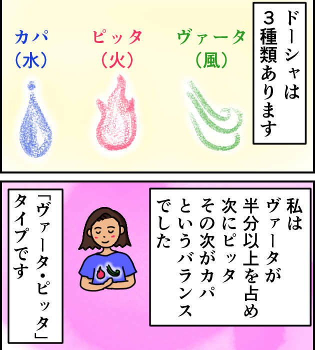 私のドーシャは「ヴァータ(風)・ピッタ(火)」タイプでした。私の体質は、ヴァータが半分以上を占めています。ヴァータは、「肌が乾燥しやすい」等の身体的特徴の他に、「好奇心旺盛で飽きっぽい」という性質もあります。当たっています(笑)