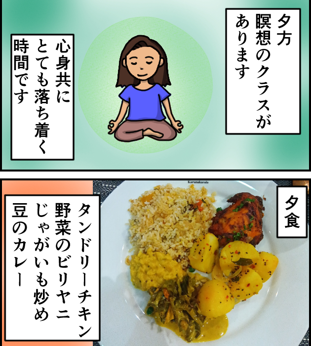 ガーデンツアー後は、屋上で瞑想クラスを受けました。こちらもヨガと同じで参加自由です。とても心が落ち着きました。夕食のじゃがいもがとても美味しかったです!